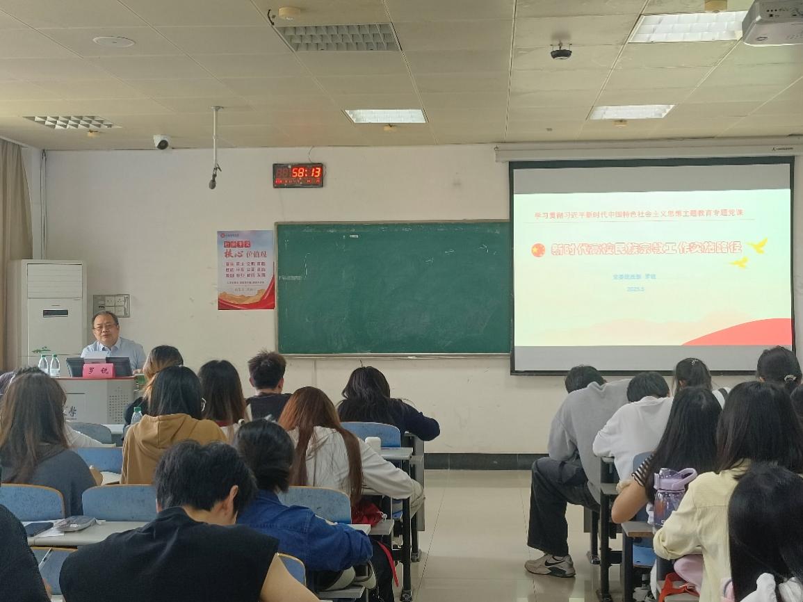 他提到,我校打造的“一核六瓣籽籽相拥”石榴红育人体系颇具借鉴意义。以铸牢中华民族共同体意识为“一核”,通过思政队伍凝心平台、红色文化铸魂平台、社会实践聚力平台、学习学业帮扶平台、校园文化浸润平台和综合素质提升平台等“六瓣”平台,全面促进学生的思想教育和综合素质提升,全方位推进民族宗教工作。同时,罗锐部长讲述了党的宗教工作基本方针和我国宗教的主要特征,强调高校在处理宗教问题时,必须充分考虑这些特征,制定科学合理的工作策略。